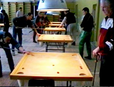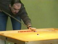 Игрок слева ставит биту на черту около борта и кием бьет по бите. Интересно куда игрок метит? | |