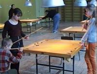 Суть игры заключается в том, чтобы забить шайбы в лузы битой. Удар по бите осуществляется кием. | |