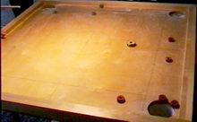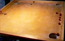 Вот это да! Залетели сразу две! (верхние). Далее игрок берет биту, опять ставит на линию и старается забить оставшиеся красные шайбы. Если промахнется, то право удара переходит сопернику. Он забивает зеленые (три штуки вверху). Выиграет тот, кто первым забьет шайбы своего цвета. | |