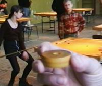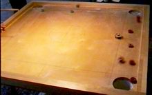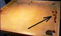 Вот это да! Залетели сразу две! (верхние). Далее игрок берет биту, опять ставит на линию и старается забить оставшиеся красные шайбы. Если промахнется, то право удара переходит сопернику. Он забивает зеленые (три штуки вверху). Выиграет тот, кто первым забьет шайбы своего цвета. | |